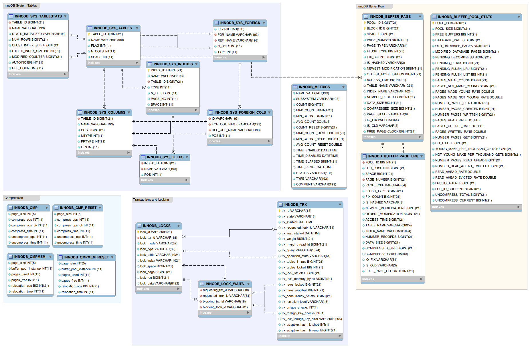 To get a rough overview how they are related to each other we have reverse engineered the ER Diagram of the InnoDB Data Dictionary. Please let us know when you see any error or if something is missing...